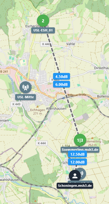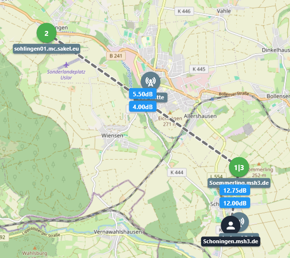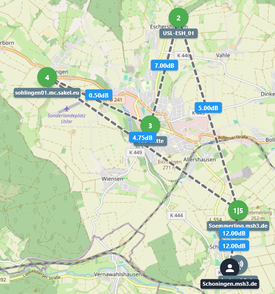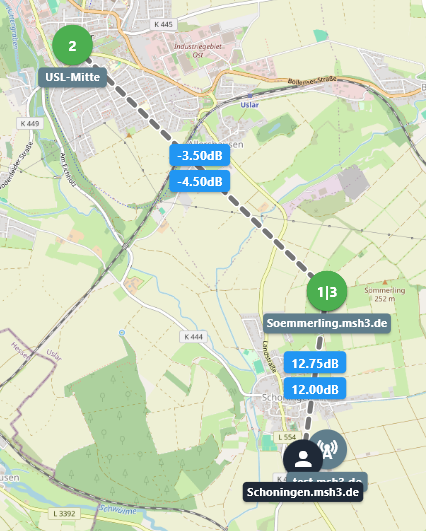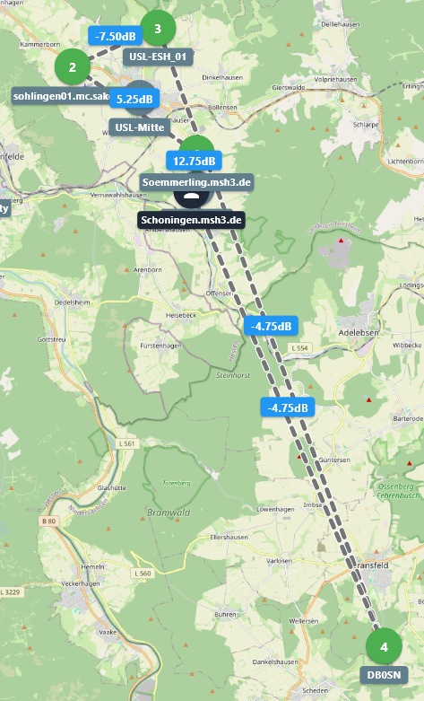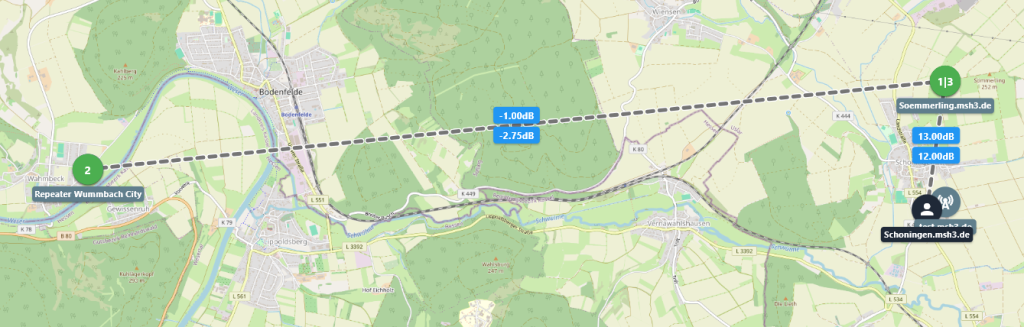 Der Link zu DB0SN war wie erwartet stabil. Insgesamt scheinen die Signalstärken mit der 5,5dB-Antenne dezent höher zu sein. Was mir sponatan aufgefallen ist, dass es zwischen RX und TX jetzt weniger Abweichung gibt. Die Verbindung im Nahfeld des Repeaters und zum heimischen Dach-Node war unverändert. Ob sich durch die andere Antenne die Verbindungen im Dorf und/oder in der Fläche verändert haben, müssen die nächsten Tage zeigen.